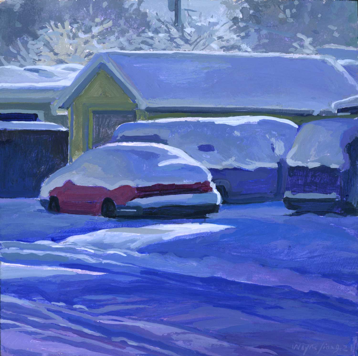 Snow Covered Cars and House, 6"x6", Acrylic on Panel, 2021,SOLD